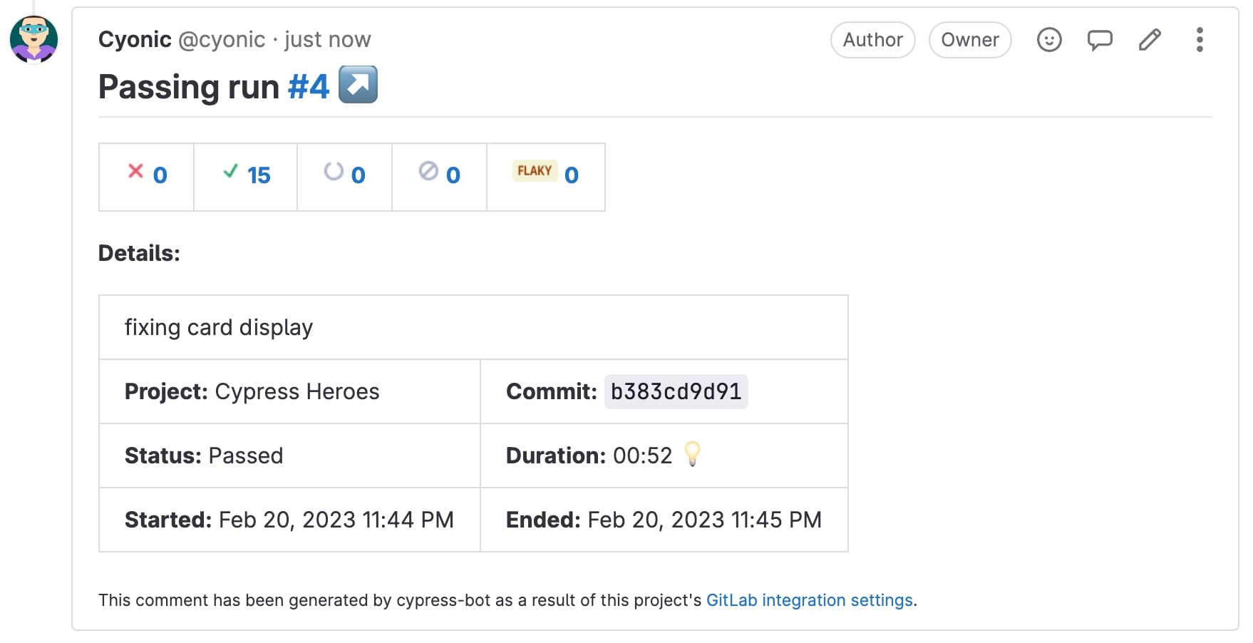 By default, Cypress will post an MR comment summarizing the run when the run completes. It will include test counts, run info, and a summary of tests that failed or were flaky.