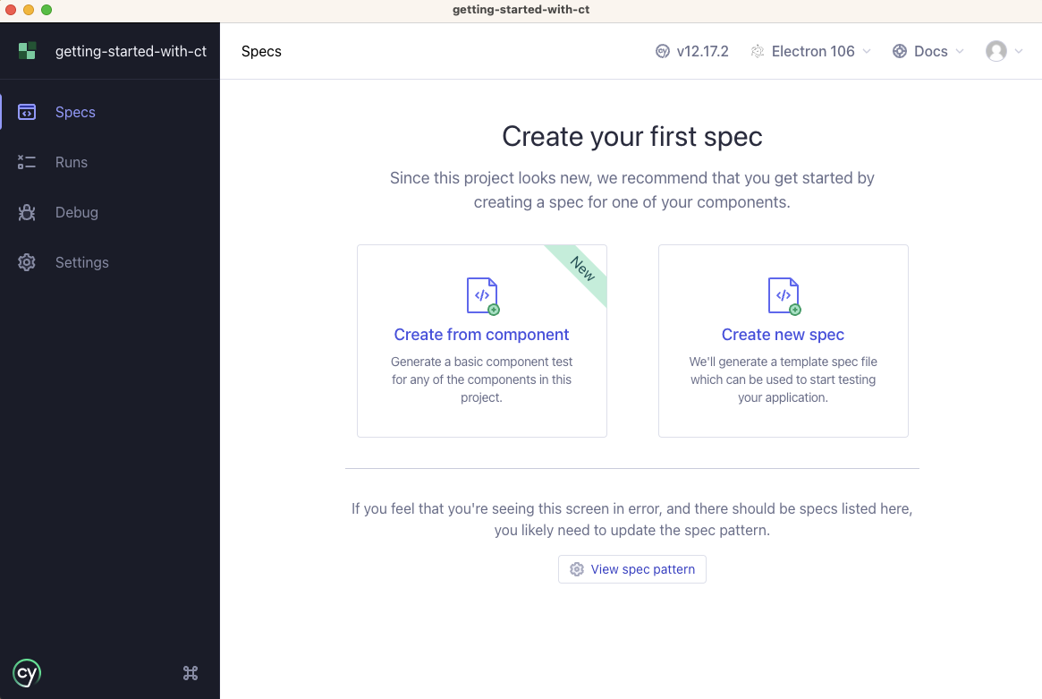 At this point, your project is configured to use Cypress Component Testing. However, when the test runner appears, it won't find any specs because we haven't created any yet. Now we need write our first Component Test.